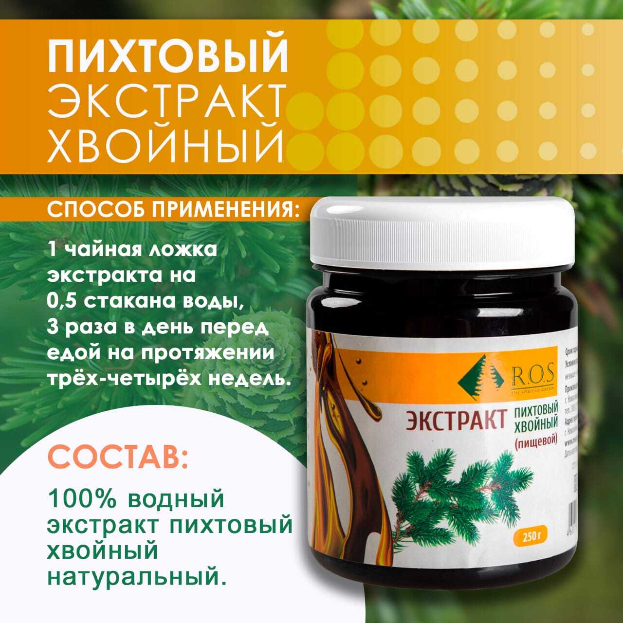 1 чайная ложка пихтового экстракта на 0,5 стакана воды, 3 раза в день перед едой на протяжении трёх-четырёх недель.